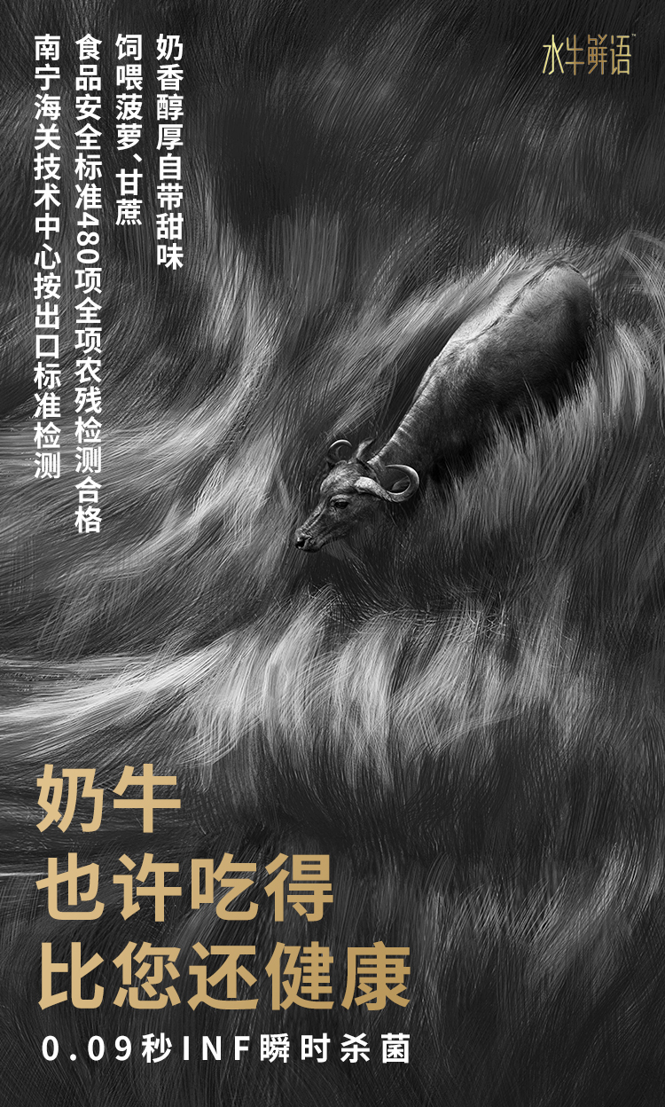 牧場位于北回歸線上,物產(chǎn)豐饒,用甘蔗菠蘿喂養(yǎng)的奶牛產(chǎn)出的奶自帶甜味。水牛奶和牛奶科學(xué)配比后,奶香醇厚卻不腥。水牛奶是“奶中精品”,水牛鮮語所含蛋白質(zhì)高于歐盟標準約21%,含鈣量遠超高鈣奶標準。