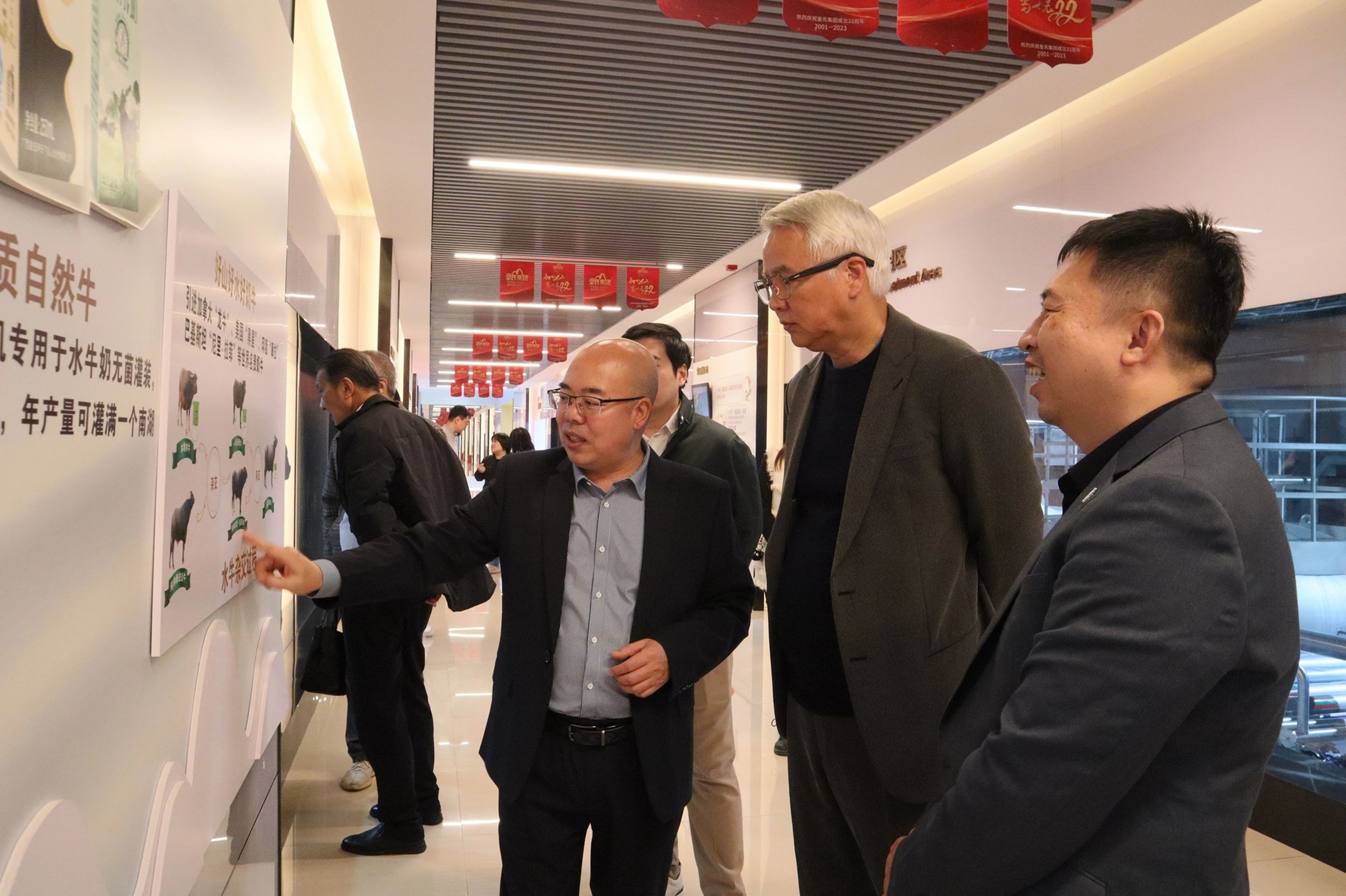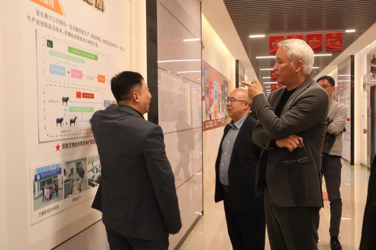 林董和史總一行首先來(lái)到皇氏集團(tuán)文化展廳,通過(guò)講解員介紹了解公司概況、發(fā)展歷程與企業(yè)文化,隨后到達(dá)皇氏中央工廠數(shù)字化生產(chǎn)車間,實(shí)地考察皇氏集團(tuán)在乳業(yè)板塊的經(jīng)營(yíng)狀況與生產(chǎn)規(guī)模,以及皇氏集團(tuán)在奶水牛品改工作領(lǐng)域的技術(shù)創(chuàng)新和最新成果。通過(guò)王總和楊總的詳細(xì)介紹,林董和史總一行對(duì)皇氏集團(tuán)的研發(fā)實(shí)力和市場(chǎng)規(guī)模給予高度認(rèn)可,并對(duì)“奶水牛種源芯片戰(zhàn)略”展現(xiàn)出濃厚興趣,雙方就該項(xiàng)目技術(shù)路線、發(fā)展前景進(jìn)行了深入交流。