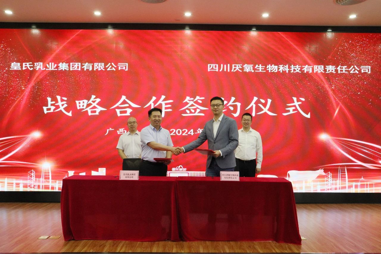 在所有與會人員的共同見證下,皇氏乳業(yè)集團副總經(jīng)理、皇氏食品研究院院長楊健與四川厭氧生物副總經(jīng)理李平凡分別代表雙方簽訂了戰(zhàn)略合作協(xié)議。