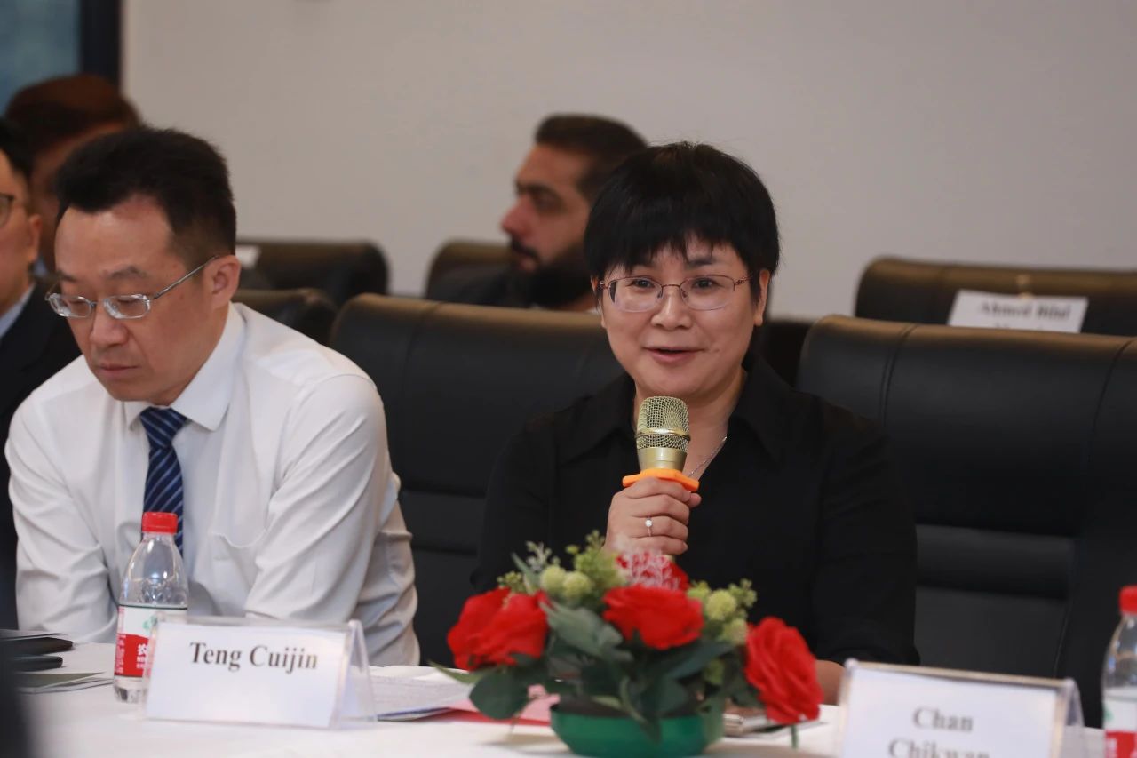 滕翠金副總裁作為中方企業(yè)代表在會(huì)上發(fā)表了講話。滕總首先介紹了皇氏集團(tuán)及皇氏賽爾公司的基本情況,她提到皇氏集團(tuán)作為中國水牛奶產(chǎn)業(yè)的領(lǐng)軍者,始終致力于為消費(fèi)者提供高品質(zhì)的水牛奶。而水牛奶以其獨(dú)特的高營養(yǎng)、高蛋白特質(zhì),在中國市場上贏得了廣大消費(fèi)者的熱烈追捧和喜愛?;适腺悹柟驹谂哉谄帐⊥顿Y建設(shè)了一個(gè)存欄規(guī)模5000頭的水牛牧場,并獲得了中國海關(guān)總署和農(nóng)業(yè)農(nóng)村部的局部貿(mào)易解禁。皇氏賽爾公司也將成為首個(gè)將巴基斯坦水牛奶出口至中國市場的企業(yè)。同時(shí),皇氏賽爾公司還將加大對(duì)乳制品、肉制品領(lǐng)域的投資,擴(kuò)大牧場規(guī)模,以滿足國內(nèi)外市場的日益增長的需求。最后滕總期望更多的中國和巴基斯坦企業(yè)能夠攜手共進(jìn),共同投資當(dāng)?shù)氐男竽翗I(yè),推動(dòng)巴基斯坦成為中亞地區(qū)一個(gè)重要的乳肉制品生產(chǎn)中心。這不僅將促進(jìn)兩國經(jīng)濟(jì)的繁榮,更將加深兩國人民之間的友誼與合作。