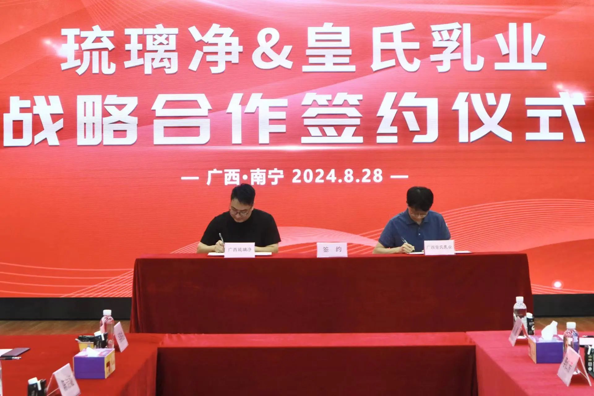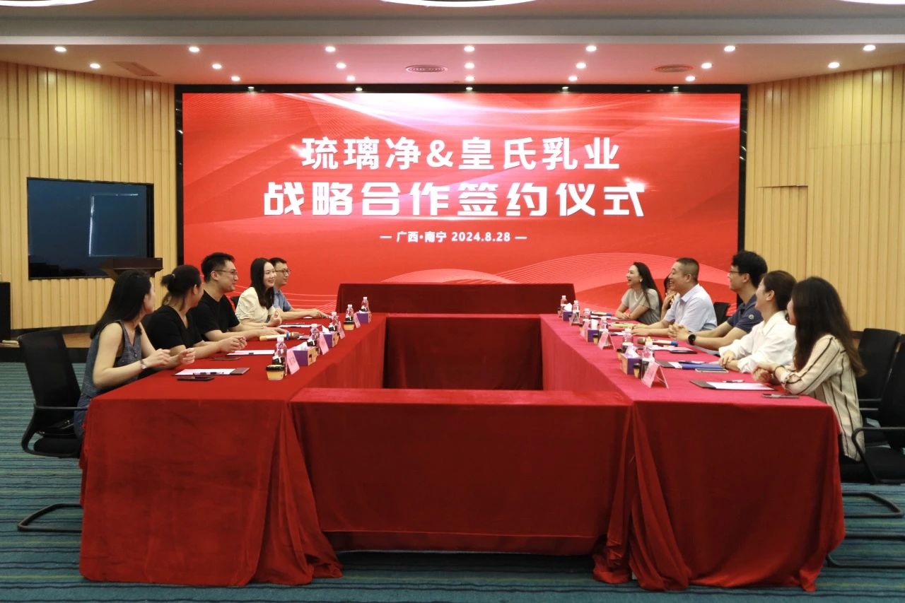 8月28日,廣西皇氏乳業(yè)有限公司(以下簡(jiǎn)稱:“皇氏乳業(yè)”)與廣西琉璃凈餐飲管理有限公司(以下簡(jiǎn)稱:“琉璃凈”)在皇氏集團(tuán)五樓多功能廳舉辦戰(zhàn)略合作協(xié)議簽署儀式?;适霞瘓F(tuán)董事、乳業(yè)集團(tuán)常務(wù)副總經(jīng)理、廣西皇氏乳業(yè)有限公司總經(jīng)理黃俊翔;廣西琉璃凈餐飲管理有限公司董事長(zhǎng)兼總經(jīng)理陳新輝出席儀式并致辭。