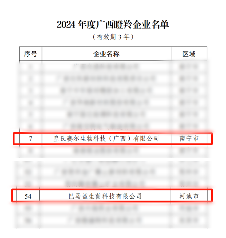 此外,皇氏集團(tuán)旗下皇氏賽爾生物科技(廣西)有限公司(以下簡(jiǎn)稱“皇氏賽爾”)、巴馬益生菌科技有限公司(以下簡(jiǎn)稱“巴馬益生菌”)憑借在專業(yè)創(chuàng)新、研發(fā)投入、成果轉(zhuǎn)化及市場(chǎng)影響力等方面的突出表現(xiàn),通過“2024年度廣西瞪羚企業(yè)”認(rèn)定、創(chuàng)新型中小企業(yè)認(rèn)定、南寧市農(nóng)業(yè)產(chǎn)業(yè)化龍頭企業(yè)認(rèn)定等,充分體現(xiàn)了上級(jí)部門對(duì)皇氏創(chuàng)新實(shí)力與發(fā)展前景的高度認(rèn)可和期望。