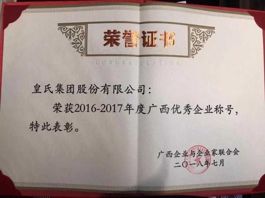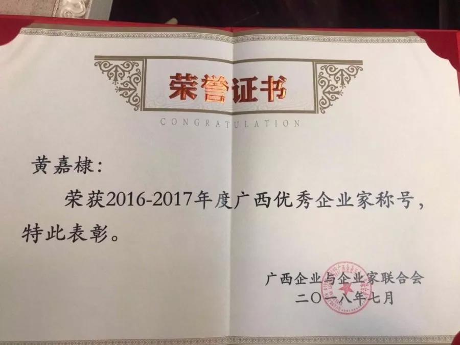 皇氏集團榮獲“2016-2017年度廣西優(yōu)秀企業(yè)”稱號,董事長黃嘉棣榮獲“2016-2017年度廣西優(yōu)秀企業(yè)家”稱號