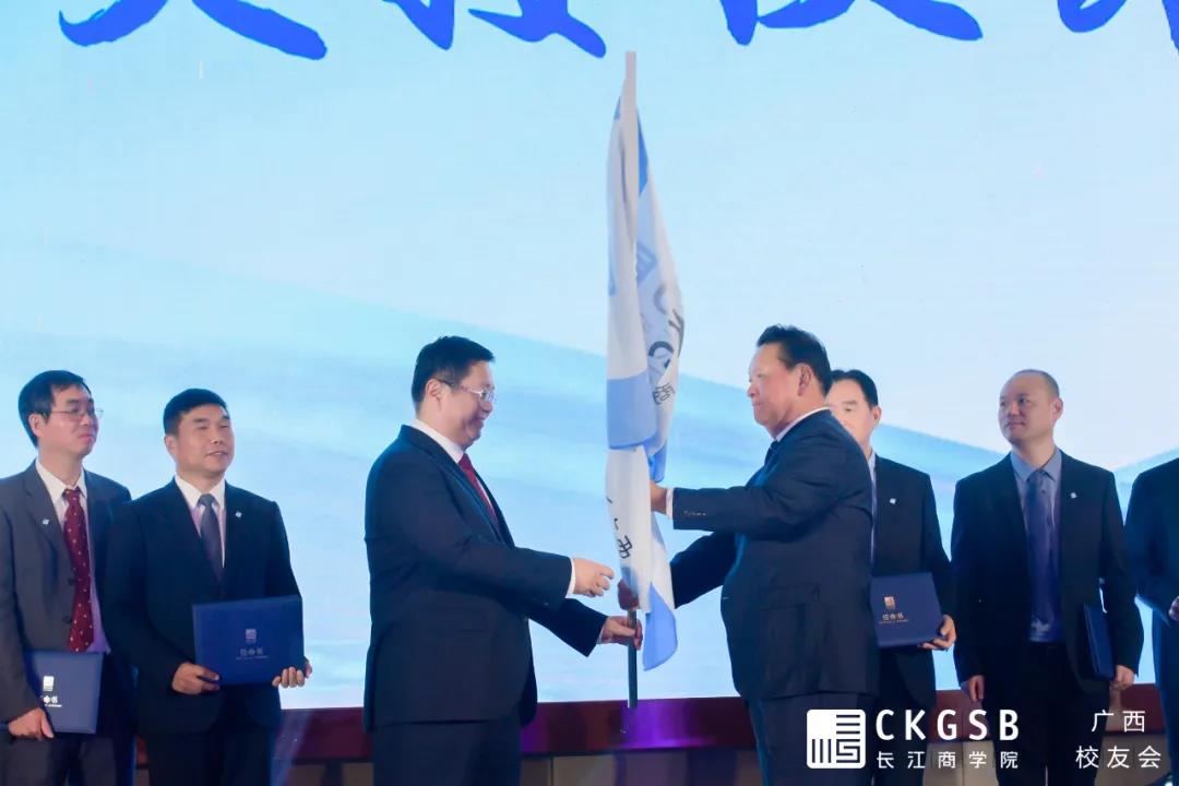 在長江商學(xué)院廣西校友會第五屆服務(wù)團(tuán)隊換屆儀式上,皇氏集團(tuán)董事長黃嘉棣榮膺長江商學(xué)院廣西校友會會長。隨后,第四屆服務(wù)團(tuán)隊會長代表馮柳江先生將長江商學(xué)院廣西校友會會旗交接給新一屆服務(wù)團(tuán)隊會長黃嘉棣董事長,在全體校友的見證和祝賀聲中黃嘉棣董事長接過這份沉甸甸的榮譽和責(zé)任。