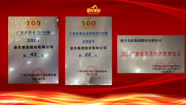7月23日,由廣西工商聯(lián)、百色市人民政府主辦,廣西科技廳、廣西工業(yè)和信息化廳等單位協(xié)辦的“2021廣西民營(yíng)企業(yè)100強(qiáng)”發(fā)布會(huì)在百色市舉辦。自治區(qū)人大常委會(huì)副主任趙樂(lè)秦,自治區(qū)副主席費(fèi)志榮,自治區(qū)政協(xié)副主席、工商聯(lián)主席磨長(zhǎng)英等領(lǐng)導(dǎo)出席本次大會(huì)。在這次盛典中,皇氏集團(tuán)股份有限公司斬獲“2021廣西民營(yíng)企業(yè)100強(qiáng)”、“2021廣西民營(yíng)企業(yè)制造業(yè)50強(qiáng)”,“廣西最具競(jìng)爭(zhēng)力民營(yíng)企業(yè)”等榮譽(yù)!
