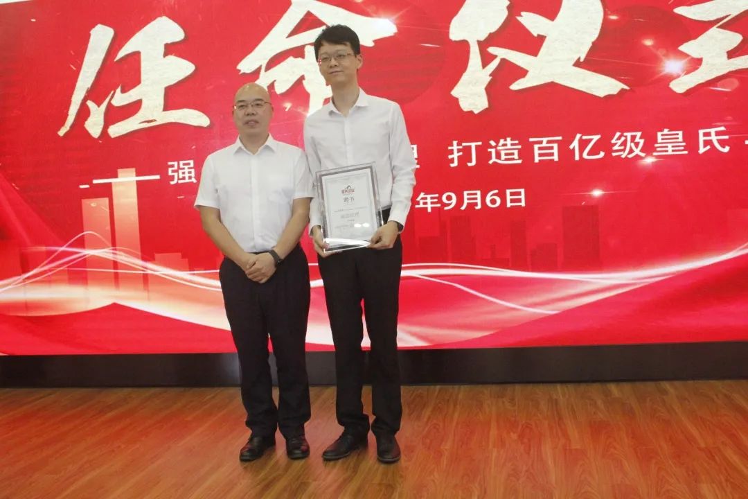 ▲王鶴飛總經(jīng)理為黃俊翔副總經(jīng)理頒發(fā)聘書