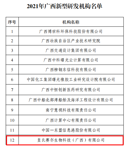 2021年11月9日,皇氏集團控股子公司皇氏賽爾生物科技(廣西)有限公司(以下簡稱“皇氏賽爾”)正式被廣西壯族自治區(qū)科技廳認定為“新型研發(fā)機構”。新型研發(fā)機構是聚焦科技創(chuàng)新需求,主要從事科學研究、技術創(chuàng)新和研發(fā)服務,投資主體多元化、管理制度現代化、運行機制市場化、用人機制靈活的獨立法人機構。