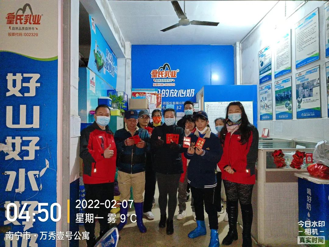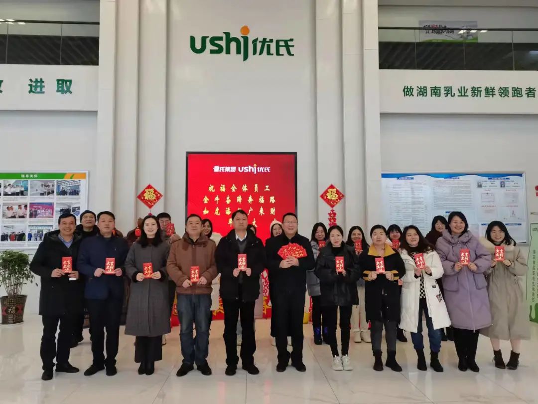 在集團(tuán)總部,皇氏集團(tuán)副董事長何海晏、副總裁王鶴飛、王婉芳、滕翠金攜皇氏乳業(yè)集團(tuán)高管團(tuán)隊(duì)、廣西皇氏乳業(yè)管理團(tuán)隊(duì)全新亮相,為員工送上新春祝福和開工紅包,把暖暖春意和關(guān)愛送給每一名員工。象征著新的一年大吉大利、一帆風(fēng)順的開年紅包,給每一位員工的臉上增添了一份喜氣。