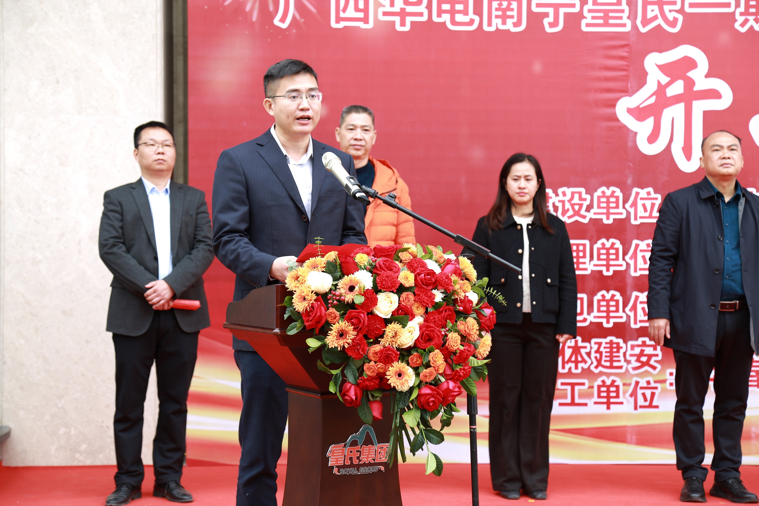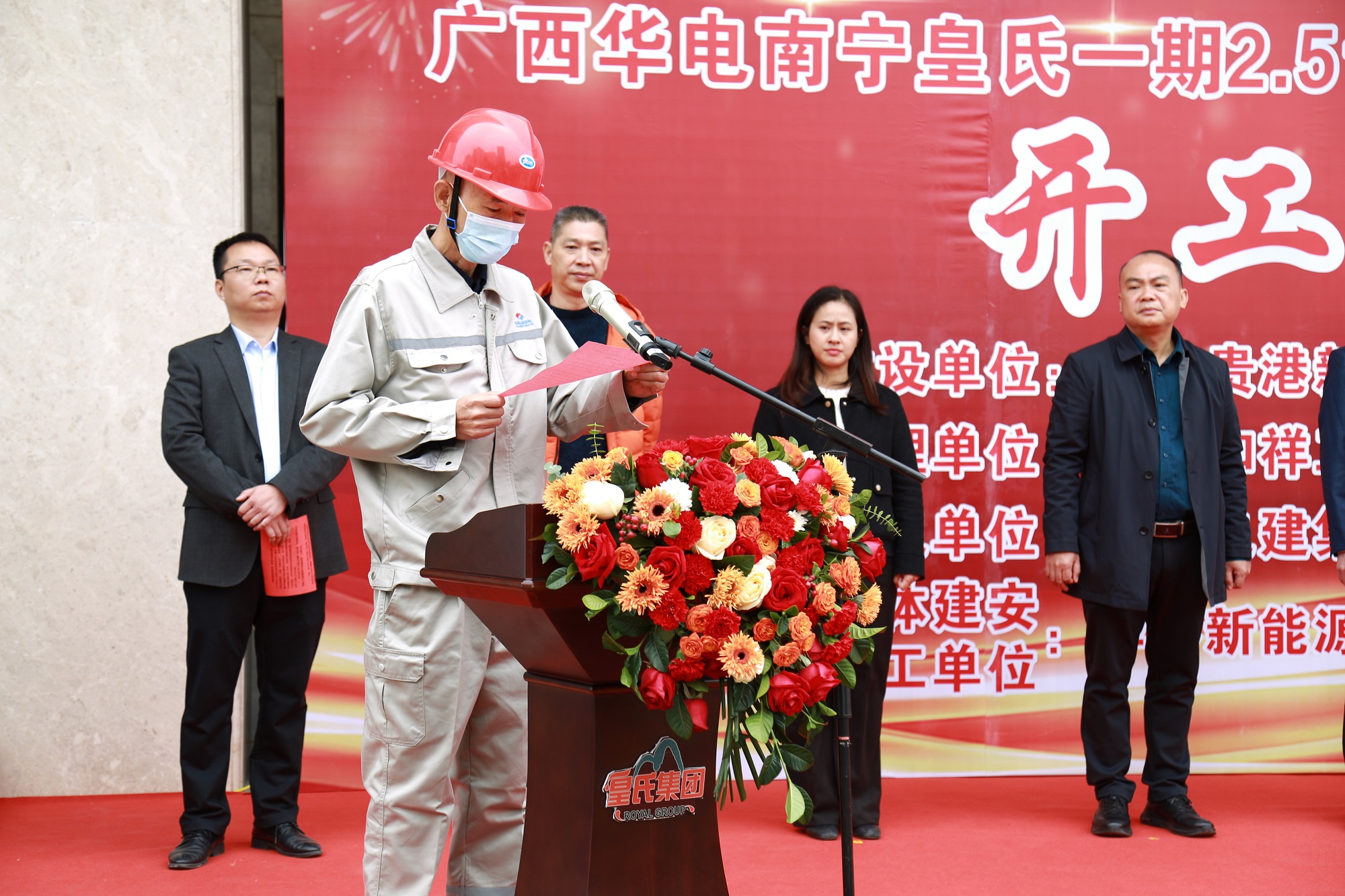 開工儀式由華電貴港新能源公司發(fā)展部副主任黃文彪主持,南寧市發(fā)展和改革委員會代表、南寧市高新區(qū)經(jīng)發(fā)局常務(wù)副局長梁巖,皇氏集團股份有限公司副董事長何海晏、華電貴港新能源有限公司執(zhí)行董事、總經(jīng)理林耿鋒等領(lǐng)導(dǎo)一行出席,同時參加儀式的還有華電貴港新能源有限公司、皇氏乳業(yè)集團有限公司、廣西皇氏乳業(yè)有限公司、皇氏農(nóng)光互補(廣西)科技有限公司領(lǐng)導(dǎo)及各參建單位代表。