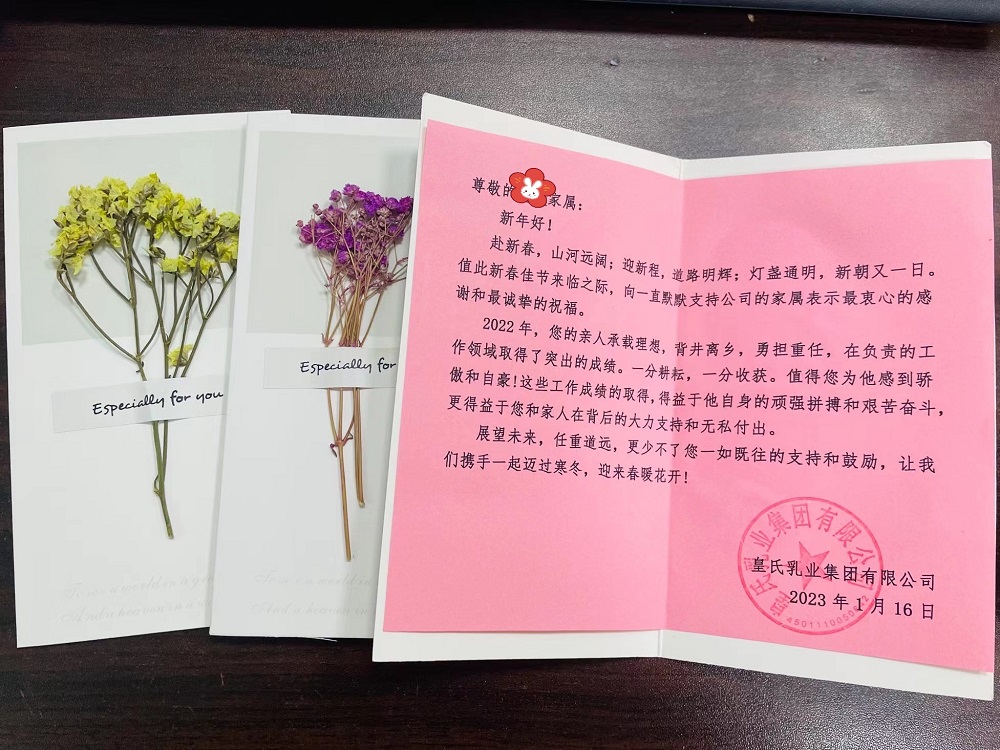 征途漫漫,共克時艱,牽手春天,縱情向前。皇氏乳業(yè)集團用真情和行動給予了外派員工家庭情感上的溫暖及精神上的鼓勵,讓外派員工及家屬在新春佳節(jié)來臨之際感受到來自公司的關愛與溫暖,用心用情構建起堅強的后方保障。未來,公司將持續(xù)完善人才管理體制機制,將發(fā)展成果最大程度惠及每位員工,切實提升員工幸福指數(shù)與獲得感,構建企業(yè)高質量發(fā)展的人才支撐。